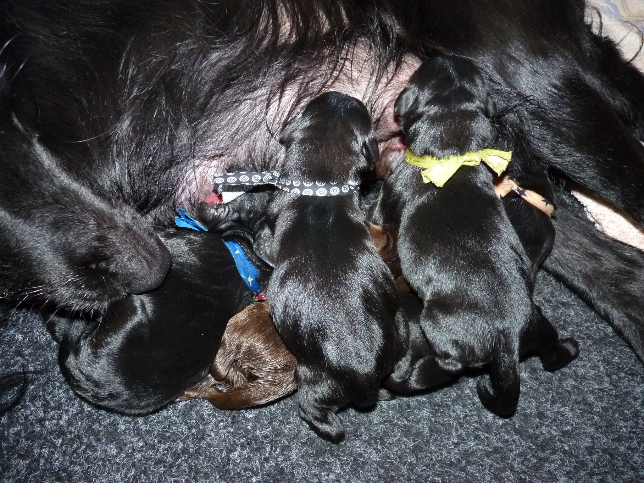 Vanochtend is de eerste pup om 8.35 uur geboren. De eerste 5 pups zijn reutjes, waarvan de laatste een leverkleur. Daarna zijn er tot dusver nog 5 zwarte teefjes bij gekomen. Of er nog meer komen?